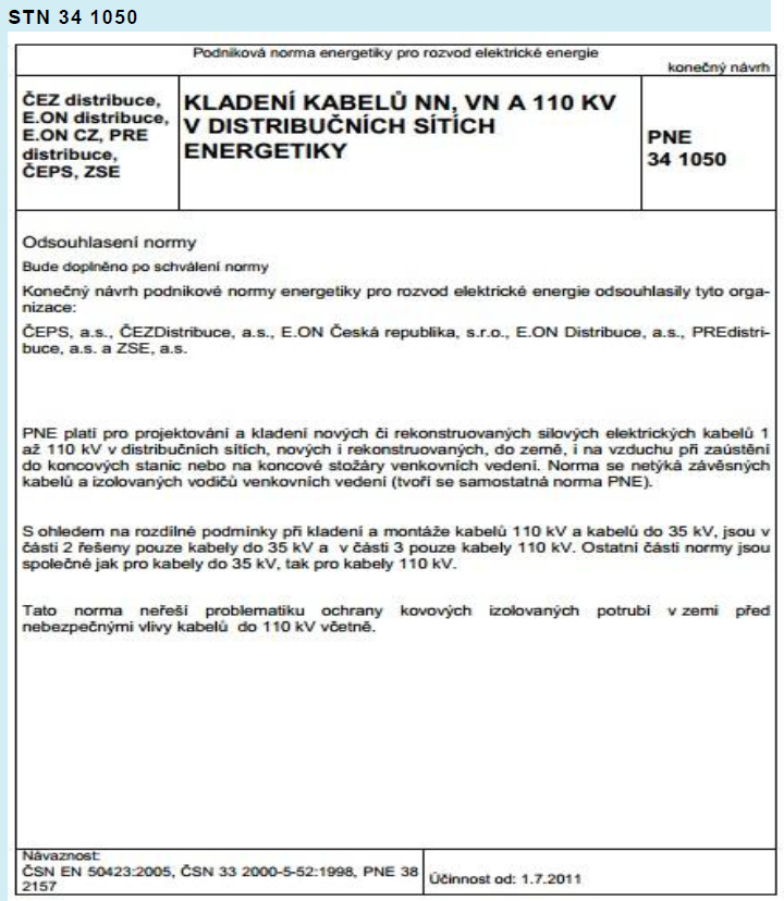 Táto norma platí pre projektovanie nových či rekonštruovaných silových elektrických káblov 1 až 110kV v distribučných sieťach, nových aj rekonštruovaných, do zeme i na vzduch pri zaústení do koncových staníc alebo na koncové stožiari vonkajšieho vedenia a nadväzuje na ČSN 33 2000-5-52 a PNE 33 3302 ed. 2 Elektrické vonkajšie vedenia s napätím do 1kV AC. Norma sa netýka zavesených káblov a izolovaných vodičov vonkajšieho vedenia (pozri PNE 34 1614).