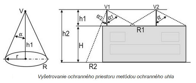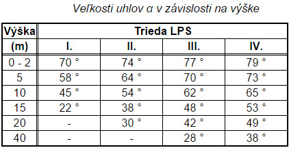 α ochranný uhol, závislý od triedy LPS a od výšky zachytávacej sústavy.