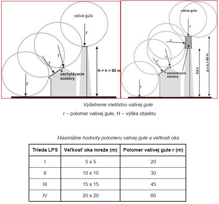 - metódy valivej gule, ktorá je vhodná vo všetkých prípadoch. Návrh zachytávacej sústavy podľa metódy valivej gule je uvedený na obrázku. Použitie tejto metódy na umiestnenie zachytávacej sústavy je dostatočné, ak nie je žiadny bod chránenej stavby v dotyku s polomerom valivej gule r, ktorá sa valí okolo chránenej stavby všetkými možnými smermi. Guľa sa tak dotýka len zachytávacou sústavou a jej polomer je závislý od triedy LPS podľa tabuľky.