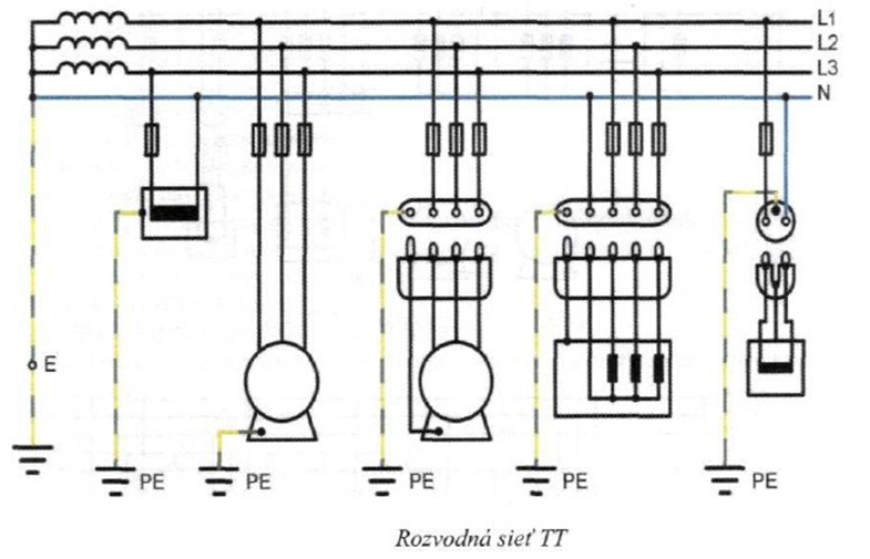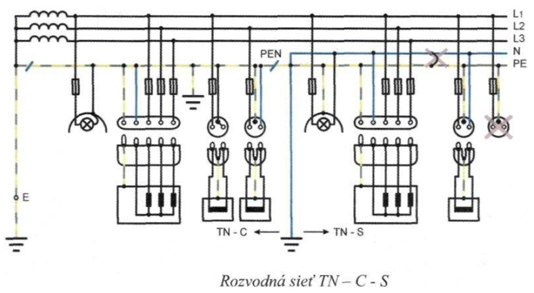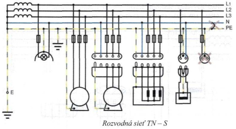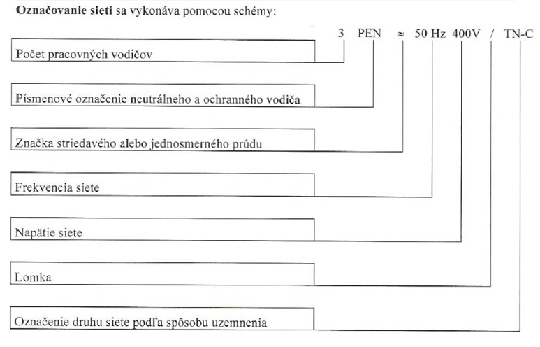 Príklad označenia striedavej trojfázovej siete TN-S: