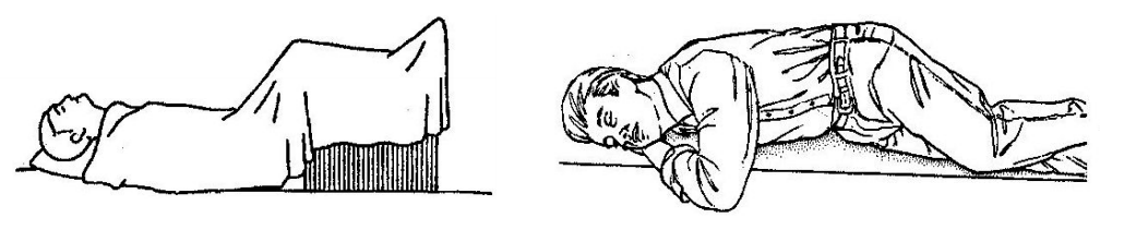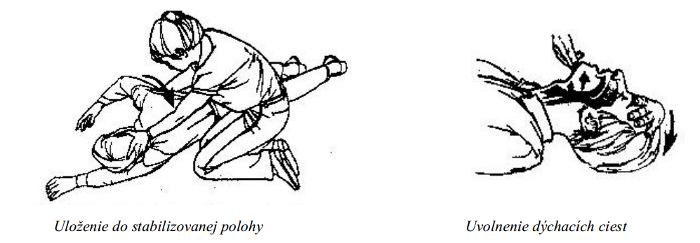 Položíme ho do polohy na chrbte (otáčame celý trup s hlavou súčasne) a uvoľníme dýchacie cesty záklonom hlavy, vysunutím brady a predsunutím čeľuste. Či postihnutý dýcha zistíme sluchom (dáme svoje ucho k jeho ústam a nosu) a zrakom sledujeme pohyb hrudníka (vdych a výdych).