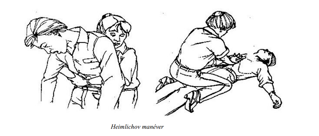 Heimlichov manéver slúži na odstránenie cudzieho telesa z dýchacích ciest pri ich úplnej nepriechodnosti. Táto situácia si vyžaduje okamžité riešenie, pretože pri úplnom zastavení dýchania, veľmi rýchlo nastane smrť. Manéver spočíva v stiahnutí bránice a následovný podbraničný tlak zosilní výdych z pľúc. Môže byť vyvolaný umelý kašeľ, ktorý odstráni cudzie teleso z dýchacích ciest. Aby nedošlo k poškodeniu vnútorných orgánov, ruku prikladáme nad pupkom v strednej čiare. Manéver opakujeme. Hlava má byť sklonená nižšie ako pľúca. Tento spôsob nie je vhodný pre tehotné ženy. U detí používame úder medzi lopatky.