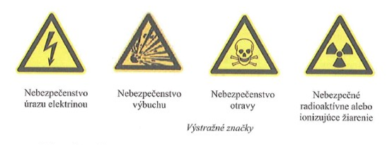 Ide o bezpečnostné značky, ktoré varujú pred rizikom alebo nebezpečenstvom úrazu napr. elektrinou explóziou, otravy, poleptania, požiaru a pod.. Základom ich vyhotovenia je žltá farba podkladu, trojholníkový tvar v čiernom orámovaní a čierne symboly. Výstražné značky musia byť umiestnené tak, aby bola výstraha nimi oznamovaná dobre viditeľná zo všetkých možných strán prístupu k zdroju nebezpečia a z potrebnej vzdialenosti. Príklady výstražných značiek sú znázornené na obrázku.