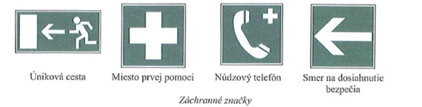Ide o bezpečnostné značky informujúce o podmienkach bezpečnosti. Základom ich vyhotovenia je zelená farba podkladu, štvrocový alebo odbĺžnikový tvar a biele symboly. Oznamujú stav bezpečia alebo iné odporúčané opatrenie na jeho zaistenie, napr. únikovú cestu či východ, cestu k zariadeniam prvej pomoci, resp. ich priamo označujú. Záchranné značky musia byť na pracovisku umiestnené tak, aby boli zo všetkých smerov dobre viditelné. Príklady záchranných značiek sú znázornené na obrázku.