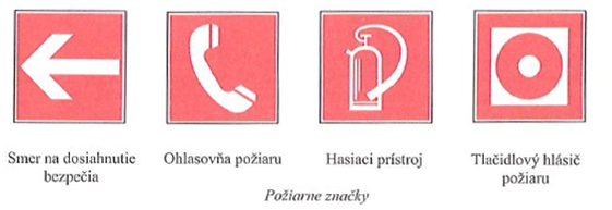 Ide o bezpečnostné značky, ktoré označujú umiestnenie zariadení, prostriedkov a materiálov slúžiacich na potreby požiarnej ochrany. Základom ich vyhotovenia je červená farba podkladu, štvorcový tvar, biele symboly. Príklady požiarnych značiek sú zobrazené na obrázku.